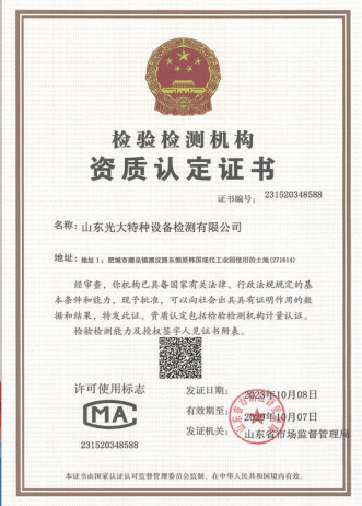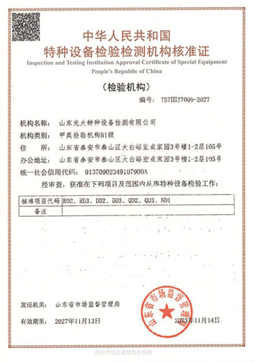 山東光大特種設備檢測有限公司是經山東省市場監督管理局核準的甲類B1特種設備綜合檢驗機構。2017年9月30日取得了山東省市場監督管理局頒發的《檢驗檢測機構資質認定證書》。2018年2月22日取得了山東省市場監督管理局頒發的《特種設備檢驗檢測機構核準證》(起重機械)檢驗檢測資質。2021年11月取得山東省市場監督管理局版發的《特種設備檢驗檢測機構核準證》(安全閥在線、離線)校驗資質。2023年11月取得山東省市場監督管理局頒發的甲類檢驗機構B1《特種設備檢驗檢測機構核準證》,具有壓力容器(RD2...